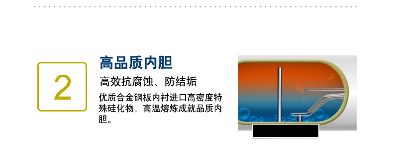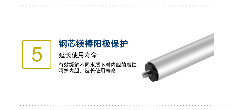 鋼芯強力陽極棒,有效緩解不同水質下對內膽的腐蝕,大大延長熱水器的使用壽命。