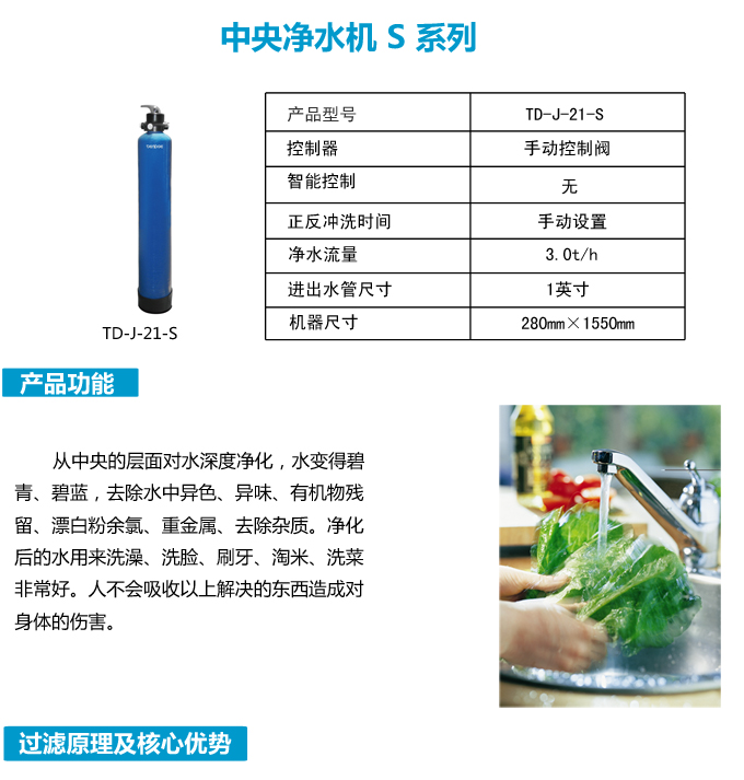 手動全屋中央凈水機有效去除水中的異色、異味;進一步濾除水中微小雜質、膠狀體;去除水中的漂白粉余氯、農藥、重金屬;保留對人體有益的礦物質。使水變得碧清、碧藍,去除對人體有害的物質。